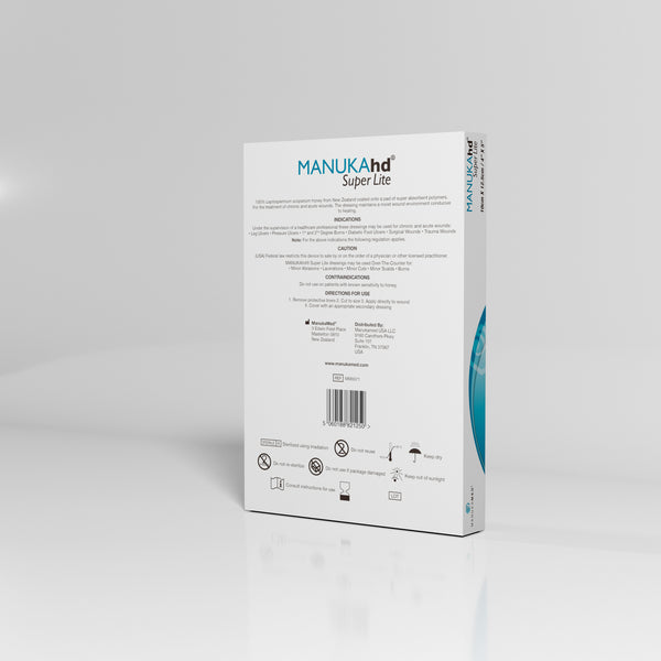Wound dressing with super-absorbent and cross-linked mesh fibers, impregnated with Manuka honey, pH of 3.0-4.5. Designed for ease of application and DAILY dressing changes for monitoring progress. Can be used in combination with other ManukaMed® formulations, such as ManukaPli, for optimal medical grade honey dosage with every dressing change.