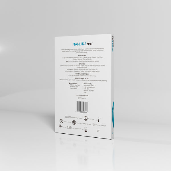 Wound dressing with permeable acetate gauze. Manuka honey with high potency medical grade, impregnated in dressing, with pH of 3.0-4.5.
